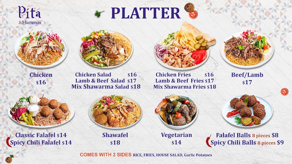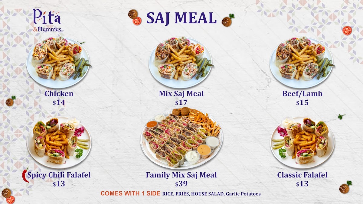 Welcome to Pita And Hummus, a delightful culinary gem nestled at 537 St Clair Ave W, Toronto. This vibrant eatery specializes in Mediterranean flavors, offering a menu that caters to both meat lovers and vegetarians. The Saj platters are a standout, featuring options like succulent chicken, spicy chili falafel, and hearty beef or lamb, all accompanied by your choice of satisfying sides such as garlic potatoes or house salad.